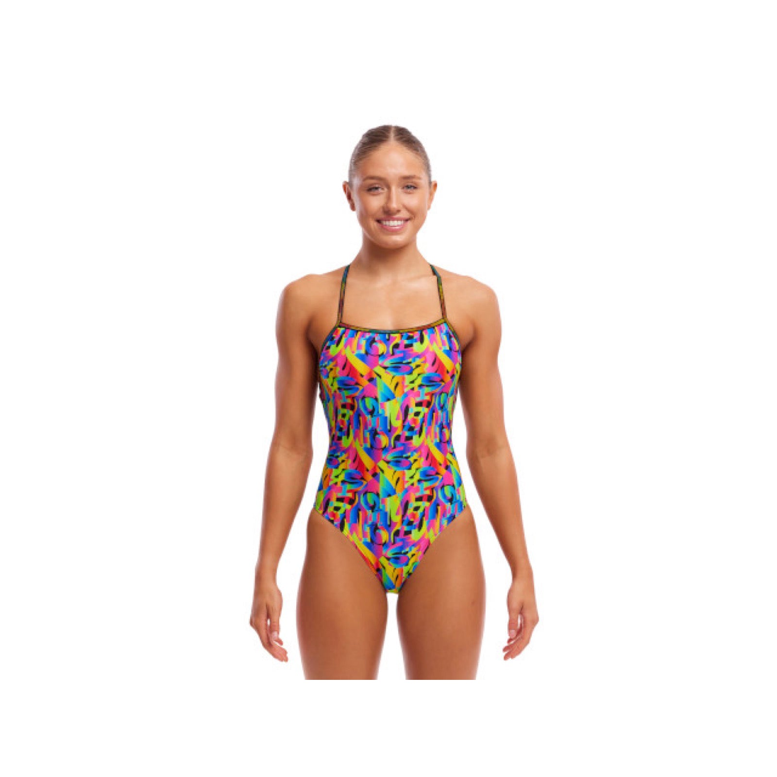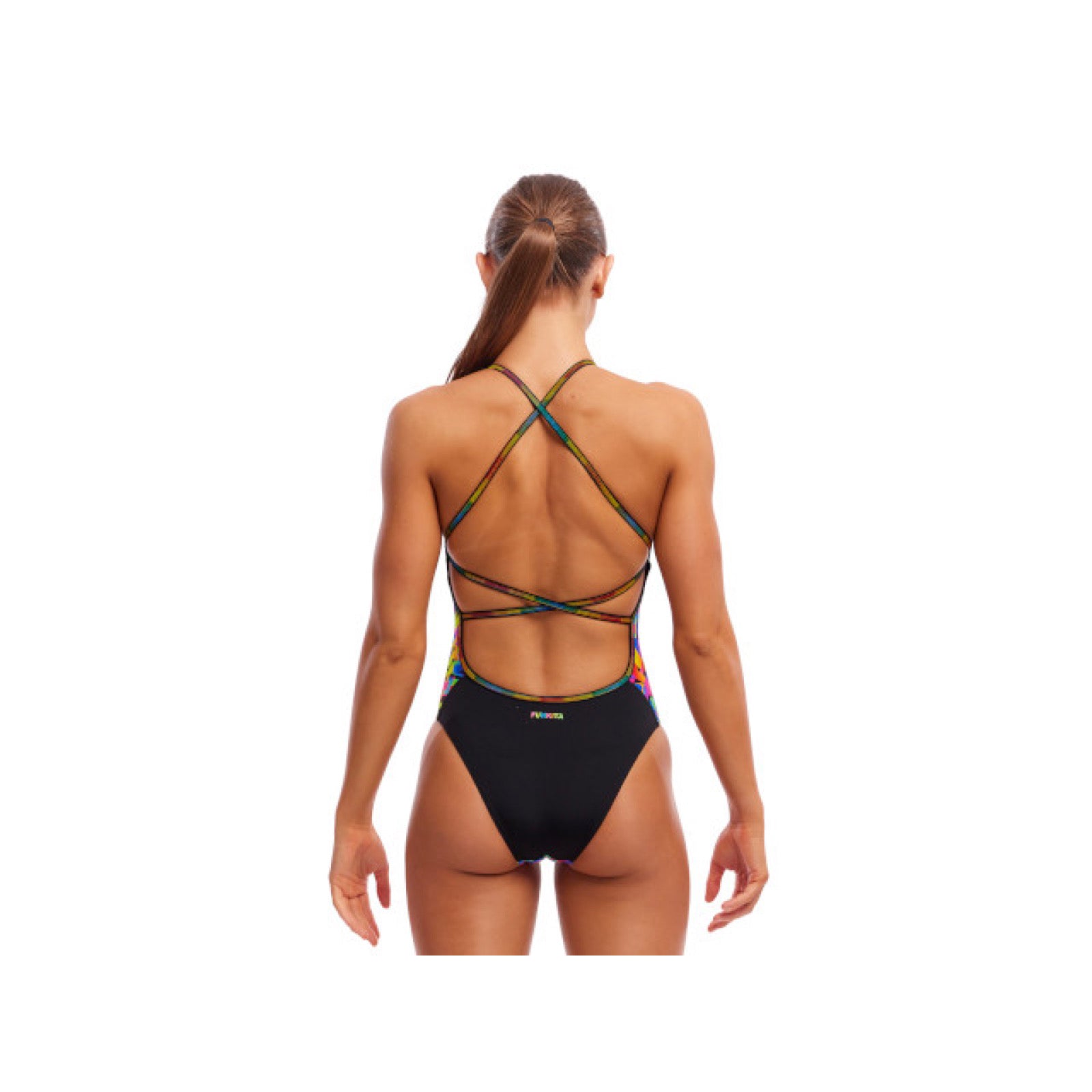 Mit dem Funkita Damen Trainingsbadeanzug Strapped In kannst du deinen Rücken gekonnt in Scene setzten. Die schmalen Träger laufen im Zick Zack über deinen Rücken und der Beinausschnitt ist extra hoch, damit du die größtmögliche Bewegungsfreiheit hast. Damit vorne nicht rausblitzen kann hat der Badeanzug ein Innenfutter im Frontbereich.